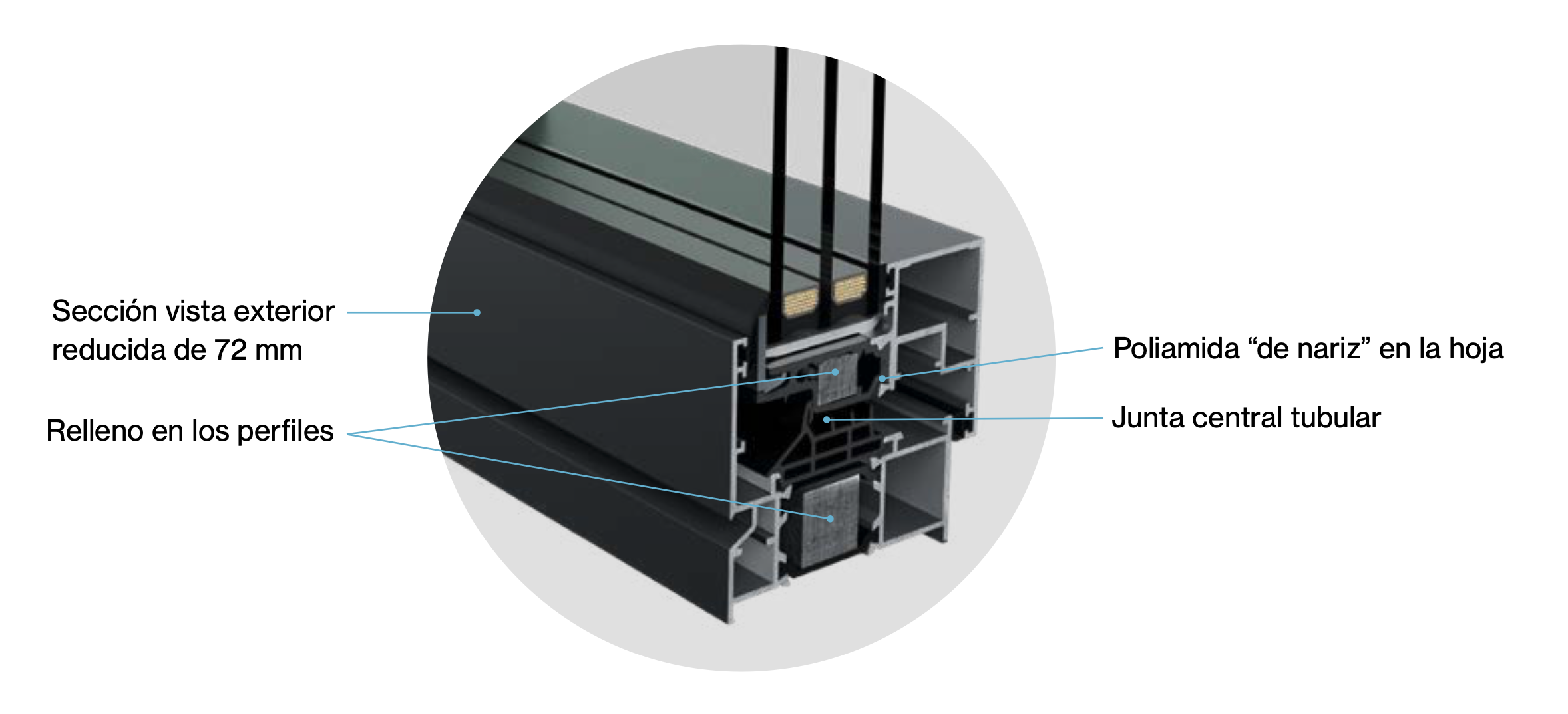 | Estanqueidad | Triple junta EPDM, con junta central tubular y poliamida de “nariz” en la hoja. Junquillo tubular |